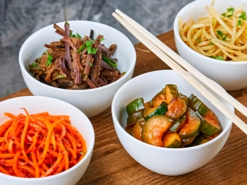 курица, рис, яйцо жареное, нори, кунжут, бульон, соус сладко-острый, микс корейских салатов