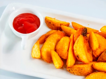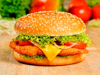 булочка, наггетсы куриные, сыр чеддер, салат, помидор, огурцы маринованные, лук, соус bbq, соус гриль