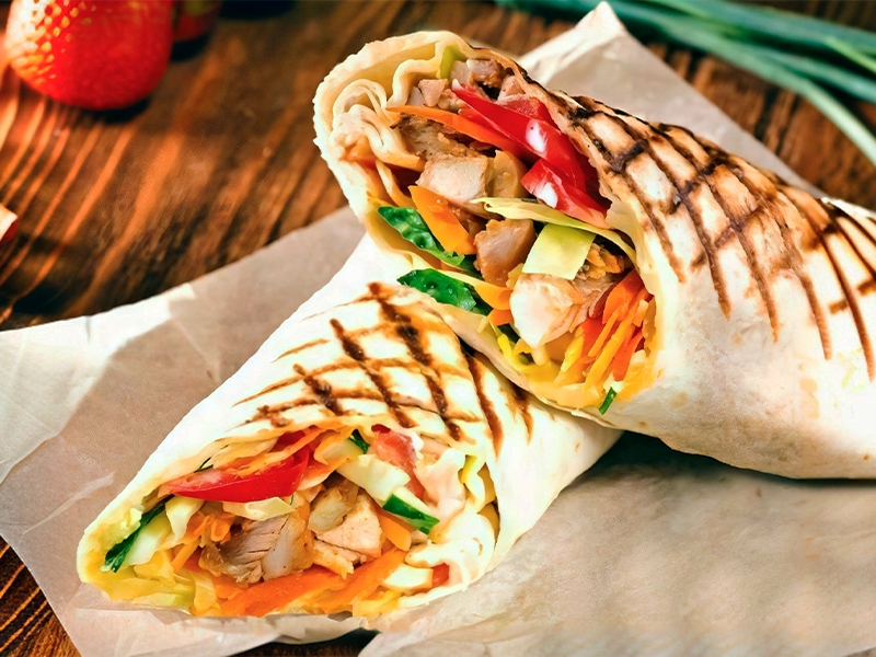 филе куриное, лепешка пшеничная, капуста, огурец, помидор, морковь маринованная, соус белый, соус красный