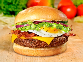 булочка, котлета говяжья, бекон, помидор, сыр чеддер, салат, огурцы маринованные, лук красный, яйцо куриное, соус bbq, соус гриль