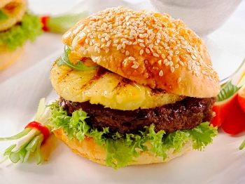 булочка, котлета куриная, ананас, салат, лук красный, сыр чеддер, перец халапенью, соус bbq, соус гриль, картофель фри, кетчуп