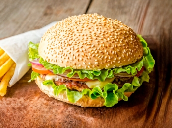 булочка, котлета говяжья, помидор, лук красный, огурцы маринованные, салат, сыр чеддер, соус bbq, соус гриль