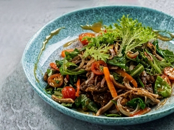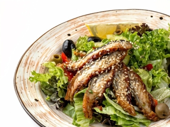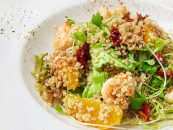мидии гигант, черри, креветки, салат, кальмар, соус песто сливочный