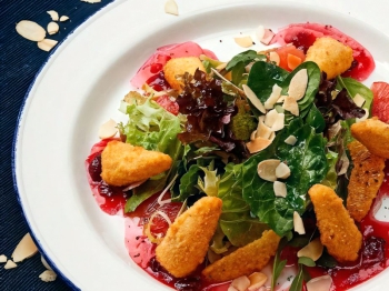 печень куриная, черри, салат, орехи кедровые, пармезан, бекон, заправка фирменная, лук красный