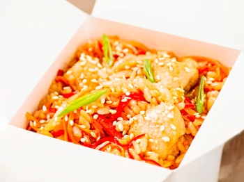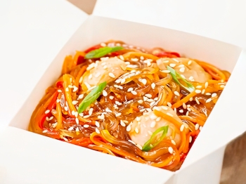 курица, лапша рисовая, цукини, перец болгарский, морковь, шампиньоны, кунжут, соус терияки