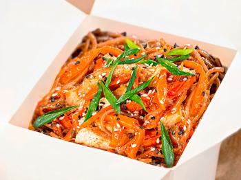 курица, лапша гречневая, цукини, перец болгарский, морковь, шампиньоны, кунжут, соус терияки
