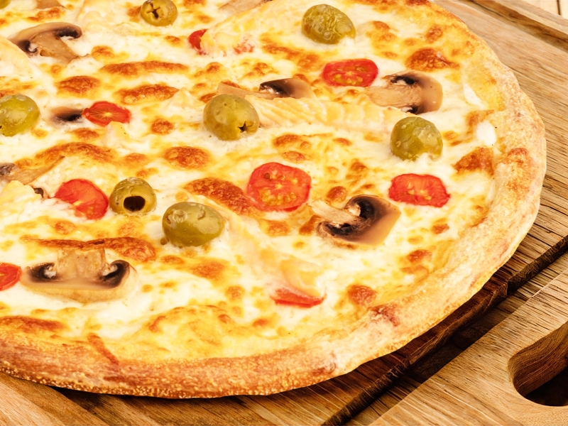колбаски охотничьи, перец болгарский, ветчина, маслины, помидор, моцарелла, соус фирменный