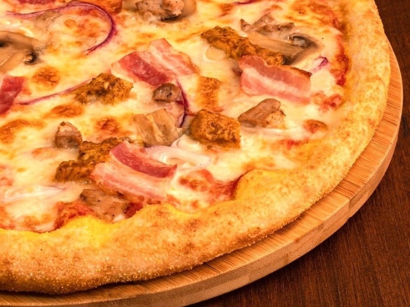 колбаски охотничьи, перец болгарский, ветчина, маслины, помидор, моцарелла, соус фирменный