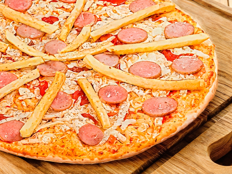 колбаски охотничьи, перец болгарский, ветчина, маслины, помидор, моцарелла, соус фирменный