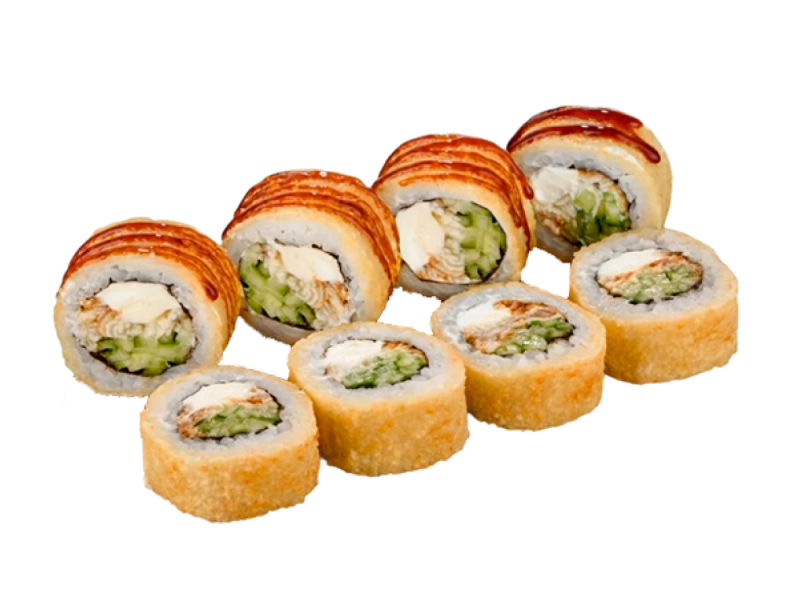 рис, угорь, креветки, сыр сливочный, огурец, панировка