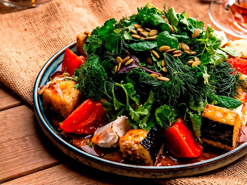баклажаны, томаты, сыр фета, салат, зелень, заправка фирменная, семечки