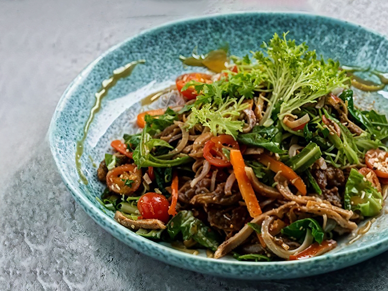 печень куриная, черри, салат, орехи кедровые, пармезан, бекон, заправка фирменная, лук красный