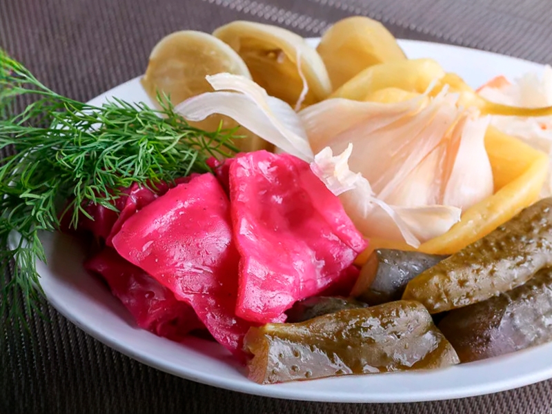 огурцы маринованные, перец маринованный, чеснок маринованный, капуста квашеная, помидоры зеленые